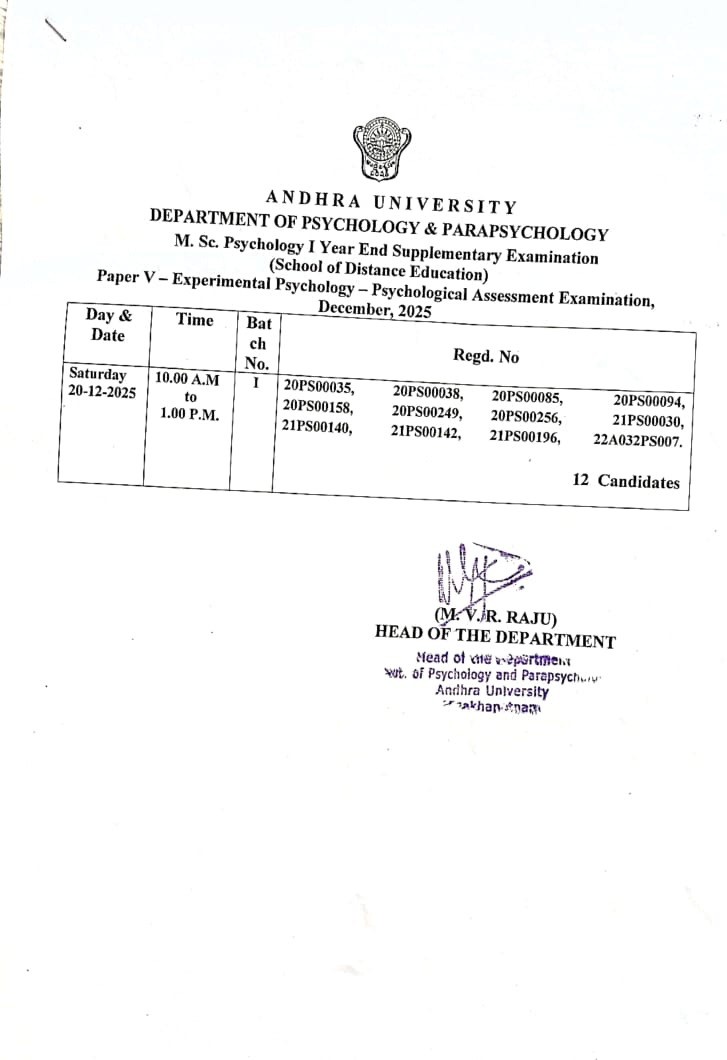 M.Sc Psychology 1 Year End Supplementary Practical Examinations -CDOE. (Click to View)